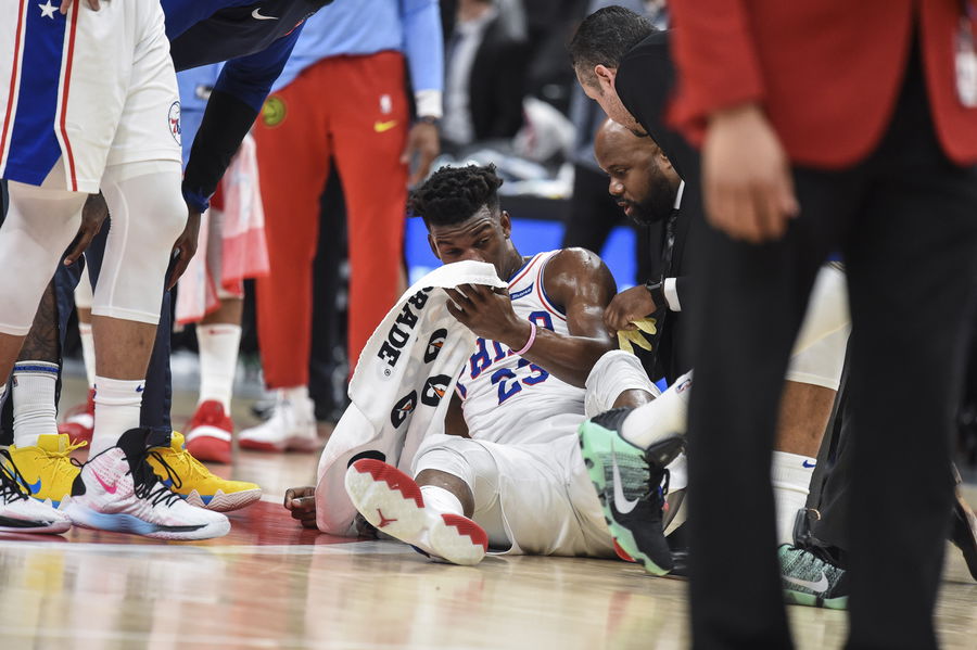 Apr 3, 2019; Atlanta, GA, USA; Philadelphia 76ers guard Jimmy Butler (23) is attended to after being injured against the Atlanta Hawks during the second half at State Farm Arena. Mandatory Credit: Dale Zanine-USA TODAY Sports