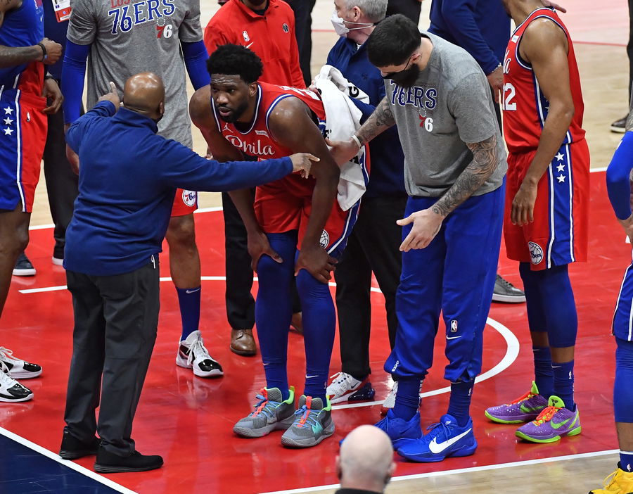 Mar 12, 2021; Washington, District of Columbia, USA; Philadelphia 76ers center Joel Embiid (middle) is examined by a trainer after suffering an apparent leg injury against the Washington Wizards during the third quarter at Capital One Arena. Mandatory Credit: Brad Mills-USA TODAY Sports