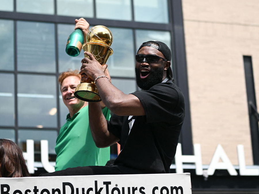 Jun 21, 2024; Boston, MA, USA; Boston Celtics guard Jaylen Brown (7) holds the MVP trophy during the 2024 NBA Championship parade in Boston. Mandatory Credit: Brian Fluharty-USA TODAY Sports