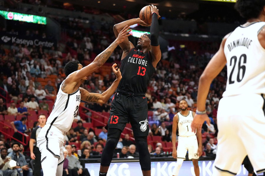 Nov 16, 2023; Miami, Florida, USA; Miami Heat center Bam Adebayo (13) takes a shot over Brooklyn Nets center Nic Claxton (33) in the first half at Kaseya Center. Mandatory Credit: Jim Rassol-USA TODAY Sports