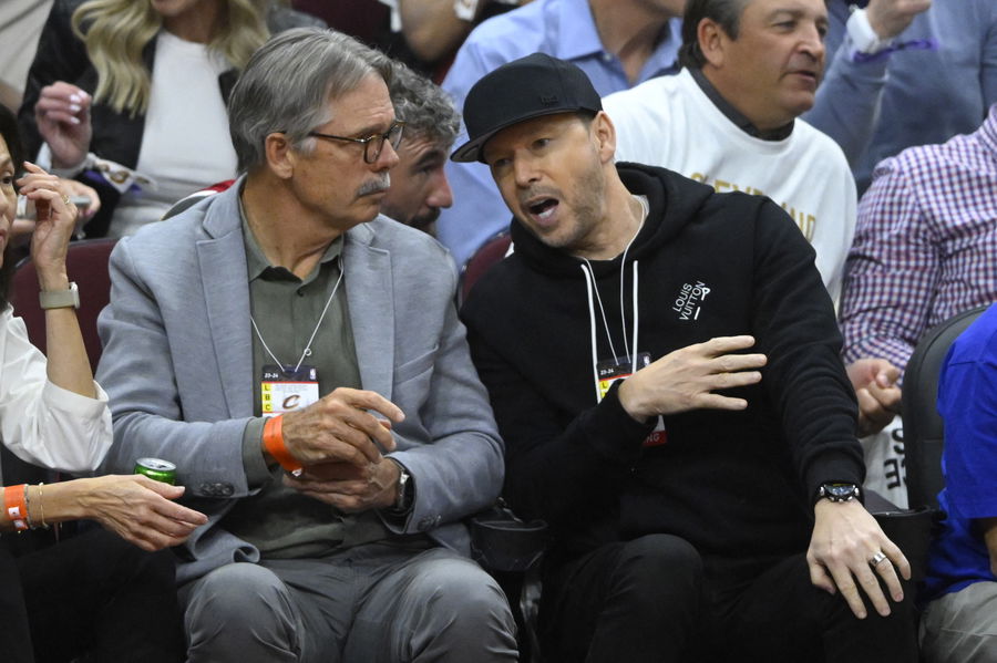 May 13, 2024; Cleveland, Ohio, USA; Singer, songwriter, actor, and producer Donnie Wahlberg (right) sits in the front row in the third quarter of game four of the second round for the 2024 NBA playoffs between the Cleveland Cavaliers and the Boston Celtics at Rocket Mortgage FieldHouse. Mandatory Credit: David Richard-USA TODAY Sports