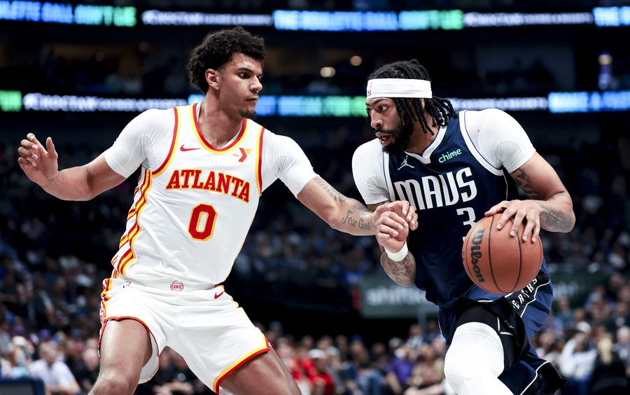Apr 2, 2025; Dallas, Texas, USA; Dallas Mavericks forward Anthony Davis (3) drives to the basket as Atlanta Hawks forward Dominick Barlow (0) defends during the first half at American Airlines Center. Mandatory Credit: Kevin Jairaj-Imagn Images
