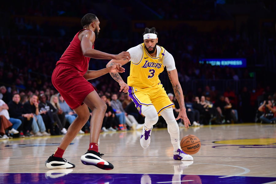 Dec 31, 2024; Los Angeles, California, USA; Los Angeles Lakers forward Anthony Davis (3) moves the ball against Cleveland Cavaliers forward Evan Mobley (4) during the first half at Crypto.com Arena. Mandatory Credit: Gary A. Vasquez-Imagn Images