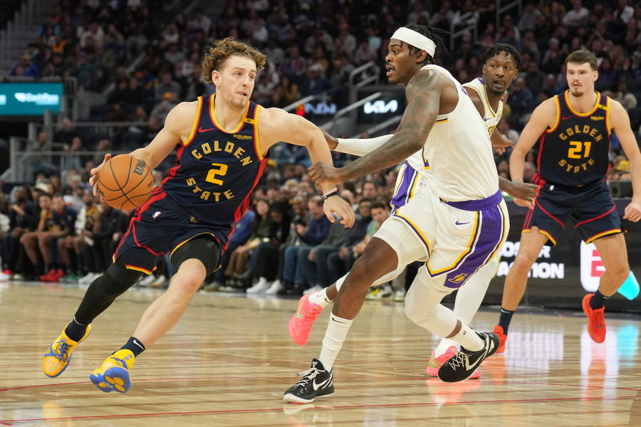 Jan 25, 2025; San Francisco, California, USA; Golden State Warriors guard Brandin Podziemski (2) dribbles against Los Angeles Lakers forward Jarred Vanderbilt (center right) during the fourth quarter at Chase Center. Mandatory Credit: Darren Yamashita-Imagn Images