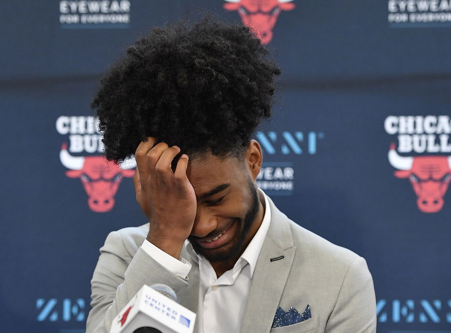 Jun 24, 2019; Chicago, IL, USA; Chicago Bulls draft pick Coby White reacts to a question during a press conference at Advocate Center. Mandatory Credit: Quinn Harris-USA TODAY Sports