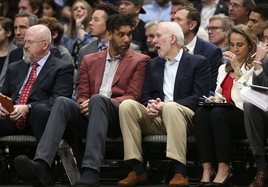Dec 26, 2019; Dallas, Texas, USA; San Antonio Spurs assistant coach Tim Duncan speaks with San Antonio Spurs head coach Gregg Popovich during the fourth quarter at American Airlines Center. Mandatory Credit: Kevin Jairaj-USA TODAY Sports