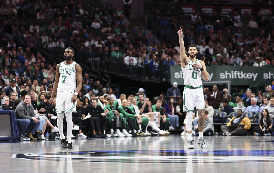 Jan 25, 2025; Dallas, Texas, USA; Boston Celtics forward Jayson Tatum (0) and Boston Celtics guard Jaylen Brown (7) react during the second half against the Dallas Mavericks at American Airlines Center. Mandatory Credit: Kevin Jairaj-Imagn Images.