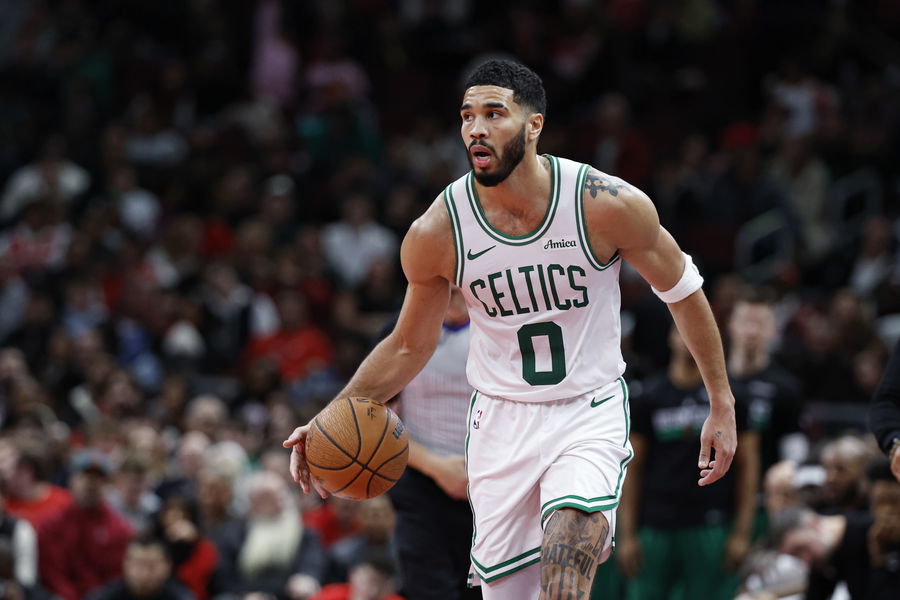 Nov 29, 2024; Chicago, Illinois, USA; Boston Celtics forward Jayson Tatum (0) brings the ball up court against the Chicago Bulls during the second half at United Center. Mandatory Credit: Kamil Krzaczynski-Imagn Images