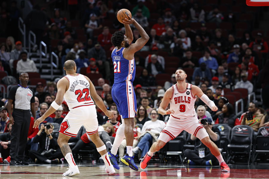 Dec 8, 2024; Chicago, Illinois, USA; Philadelphia 76ers center Joel Embiid (21) shoots against Chicago Bulls center Nikola Vucevic (9) during the first half at United Center. Mandatory Credit: Kamil Krzaczynski-Imagn Images