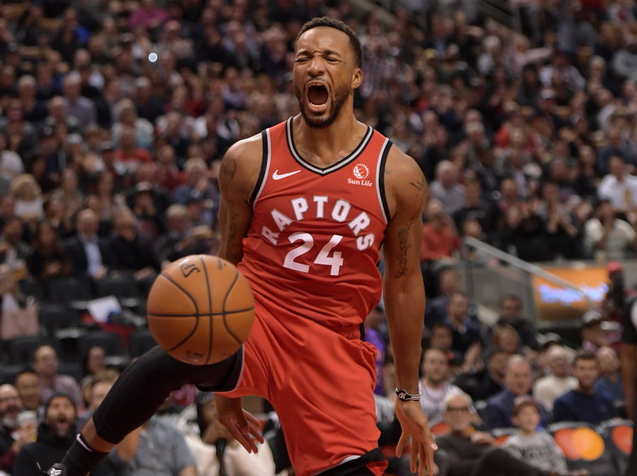 Nov 18, 2019; Toronto, Ontario, CAN; Toronto Raptors guard Norman Powell (24) reacts after dunking for a basket against Charlotte Hornets in the second half at Scotiabank Arena. Mandatory Credit: Dan Hamilton-USA TODAY Sports