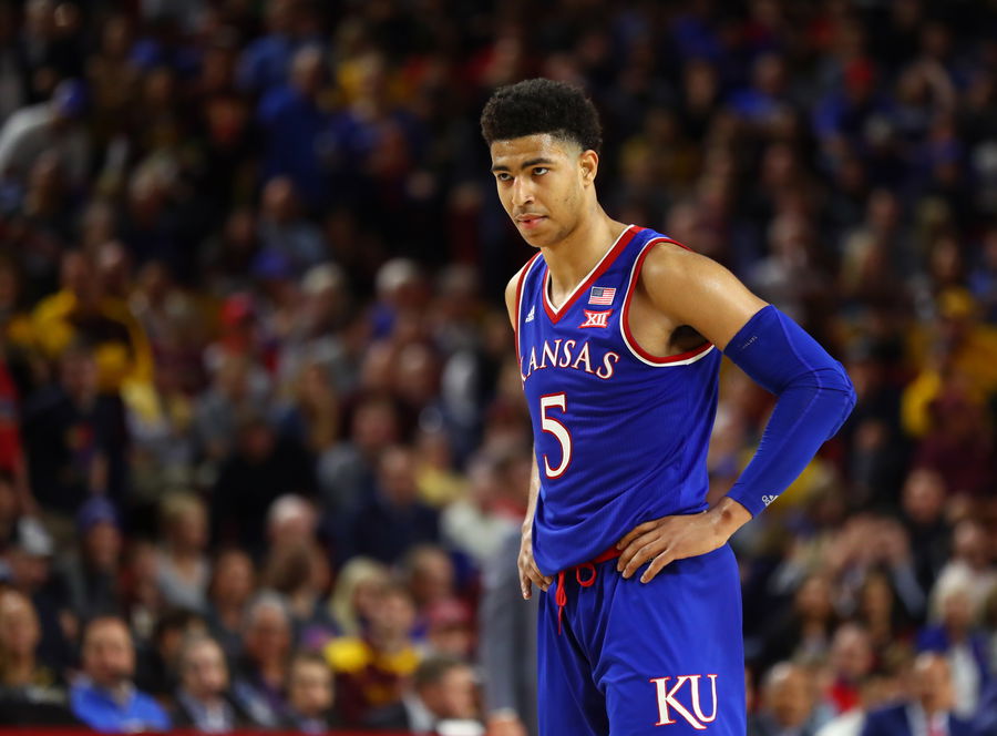 Dec 22, 2018; Tempe, AZ, USA; Kansas Jayhawks guard Quentin Grimes (5) against the Arizona State Sun Devils at Wells Fargo Arena (AZ). Mandatory Credit: Mark J. Rebilas-USA TODAY Sports