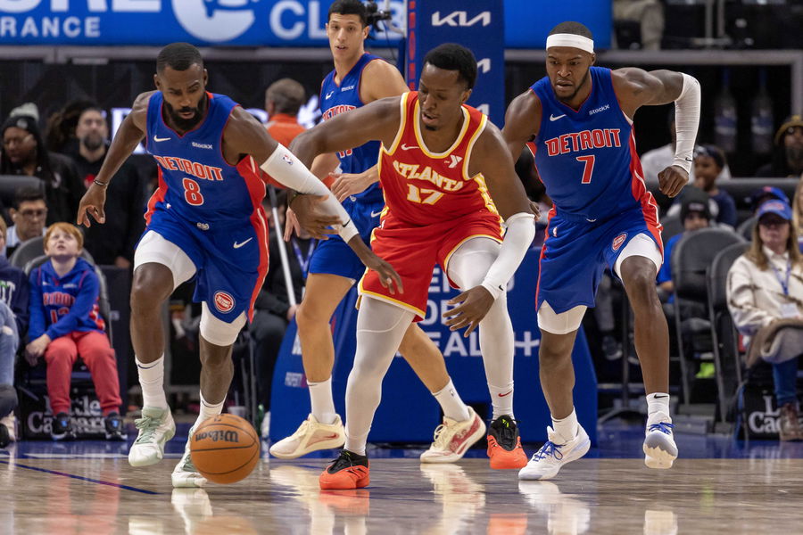 Nov 8, 2024; Detroit, Michigan, USA; Detroit Pistons forward Tim Hardaway Jr. (8) blocks a pass to Atlanta Hawks forward Onyeka Okongwu (17) during the second half at Little Caesars Arena. Mandatory Credit: David Reginek-Imagn Images
