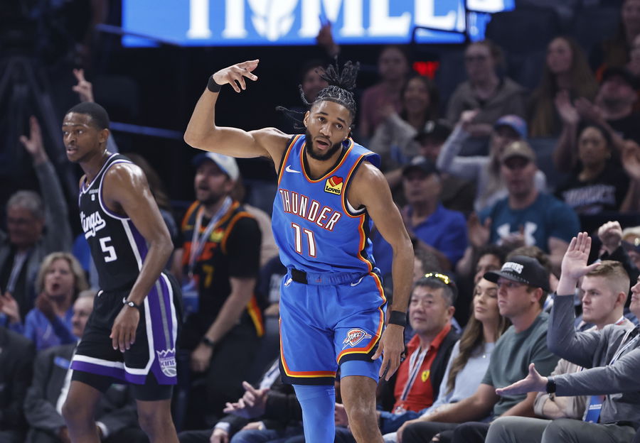 Apr 9, 2024; Oklahoma City, Oklahoma, USA; Oklahoma City Thunder guard Isaiah Joe (11) gestures after scoring a three-point basket against the Sacramento Kings during the second quarter at Paycom Center. Mandatory Credit: Alonzo Adams-USA TODAY Sports