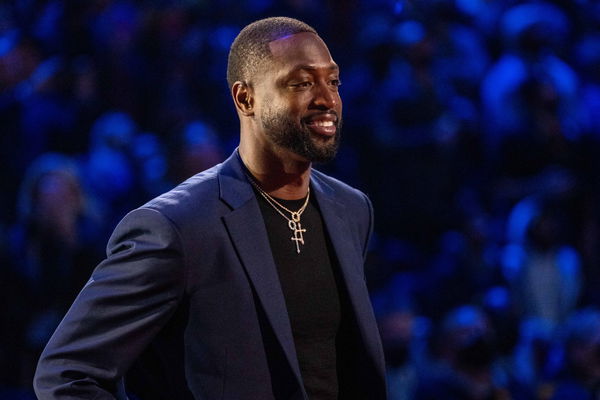 February 20, 2022; Cleveland, Ohio, USA; NBA great Dwyane Wade is honored for being selected to the NBA 75th Anniversary Team during halftime in the 2022 NBA All-Star Game at Rocket Mortgage FieldHouse. Mandatory Credit: Kyle Terada-USA TODAY Sports