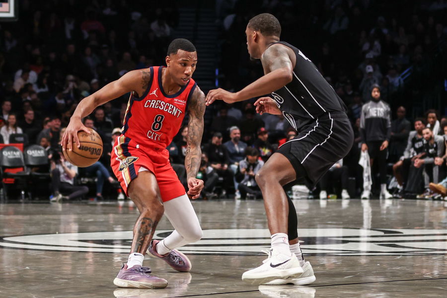 Apr 8, 2025; Brooklyn, New York, USA; New Orleans Pelicans forward Jamal Cain (8) looks to drive past Brooklyn Nets forward Dariq Whitehead (0) in the fourth quarter at Barclays Center. Mandatory Credit: Wendell Cruz-Imagn Images