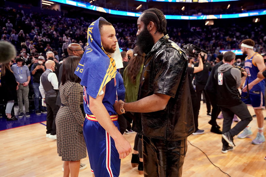 Jan 29, 2022; San Francisco, California, USA; Golden State Warriors guard Stephen Curry (left) meets with Brooklyn Nets guard James Harden after a game at the Chase Center. Mandatory Credit: Cary Edmondson-USA TODAY Sports