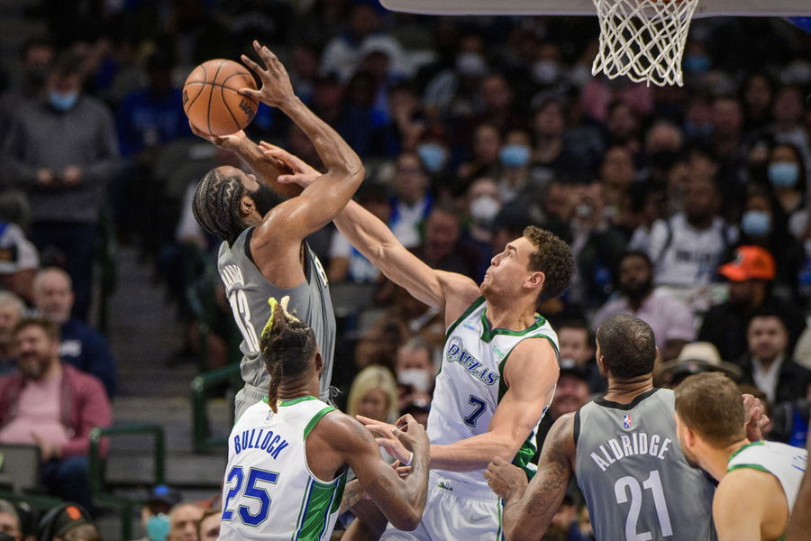 Dec 7, 2021; Dallas, Texas, USA; Dallas Mavericks center Dwight Powell (7) defends against Brooklyn Nets guard James Harden (13) during the second quarter at the American Airlines Center. Mandatory Credit: Jerome Miron-USA TODAY Sports