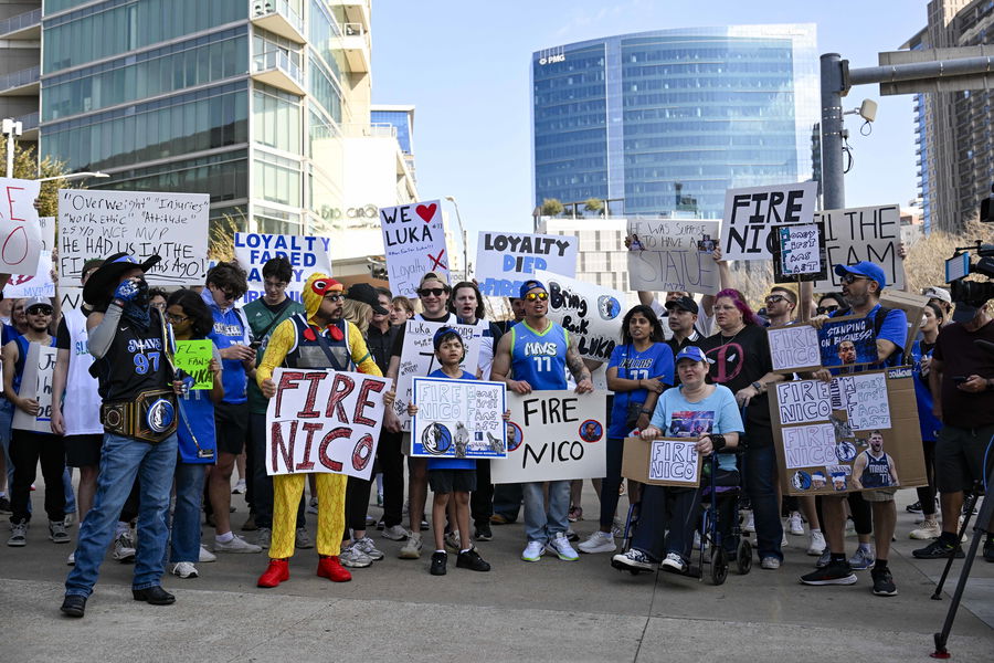 Feb 8, 2025; Dallas, Texas, USA; Dallas Mavericks fans gather outside the arena before the game between the Dallas and the Houston Rockets to protest the Nico Harrison trade of former Mavericks point guard Luka Doncic to the Los Angeles Lakers. Mandatory Credit: Jerome Miron-Imagn Images