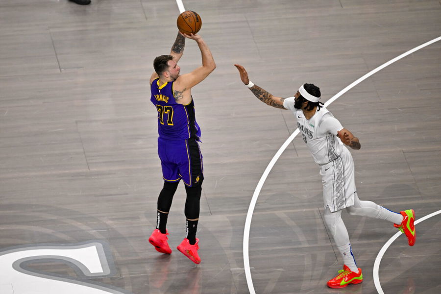 Apr 9, 2025; Dallas, Texas, USA; Los Angeles Lakers guard Luka Doncic (77) makes a jump shot over Dallas Mavericks forward Anthony Davis (3) during the first quarter at the American Airlines Center. Mandatory Credit: Jerome Miron-Imagn Images