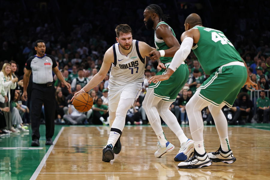 Jun 17, 2024; Boston, Massachusetts, USA; Dallas Mavericks guard Luka Doncic (77) dribbles the ball against Boston Celtics guard Jaylen Brown (7) during the second quarter in game five of the 2024 NBA Finals at TD Garden. Mandatory Credit: Peter Casey-USA TODAY Sports