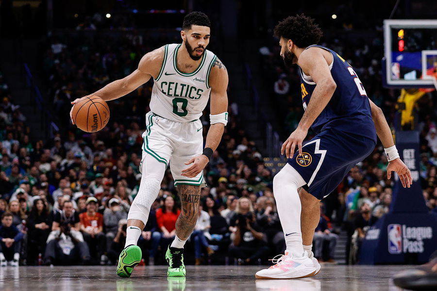 Jan 7, 2025; Denver, Colorado, USA; Boston Celtics forward Jayson Tatum (0) controls the ball as Denver Nuggets guard Jamal Murray (27) guards in the fourth quarter at Ball Arena. Mandatory Credit: Isaiah J. Downing-Imagn Images