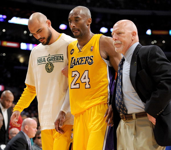 April 12, 2013; Los Angeles, CA, USA; Los Angeles Lakers trainer Gary Vitti and center Robert Sacre (50) help shooting guard Kobe Bryant (24) as leaves the game in the fourth quarter against the Golden State Warriors at the Staples Center. Bryant suffered a torn Achilles tendon. He under went surgery April 13 and is expected to miss six to nine months. Mandatory Credit: Jayne Kamin-Oncea-USA TODAY Sports