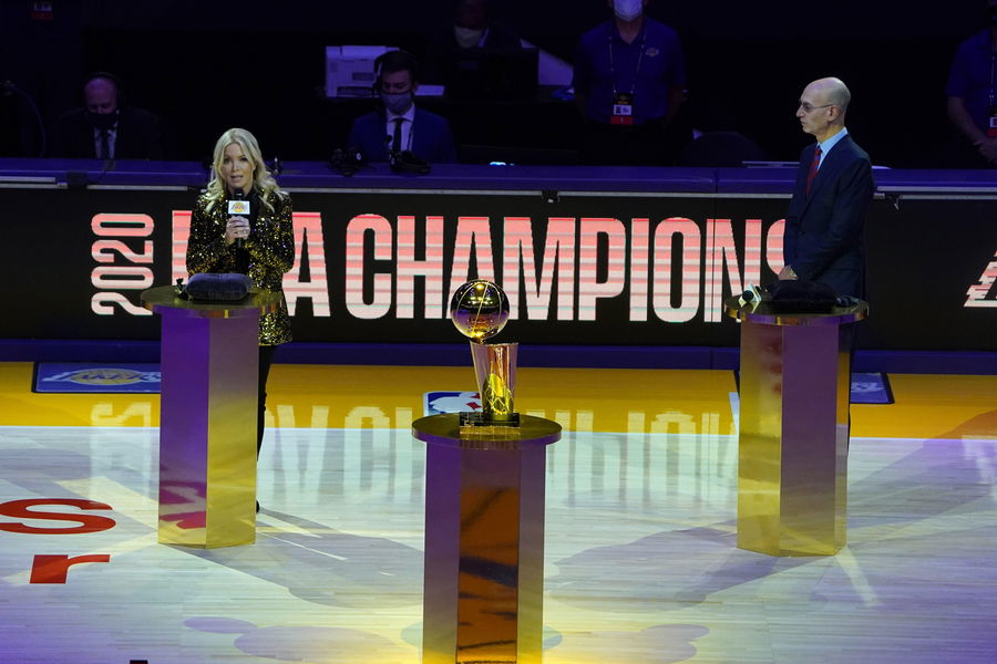 Dec 22, 2020; Los Angeles, California, USA; Los Angeles Lakers owner Jeanie Buss (left) and NBA commissioner Adam Silver speak at 2020 NBA Championship ring ceremony before a game between the Lakers and the Los Angeles Clippers at Staples Center. Mandatory Credit: Kirby Lee-USA TODAY Sports