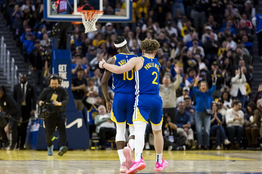 Feb 23, 2025; San Francisco, California, USA; Golden State Warriors guard Brandin Podziemski (2) and forward Jimmy Butler III (10) reacts during the fourth quarter of the game against the Dallas Mavericks at Chase Center. Mandatory Credit: John Hefti-Imagn Images
