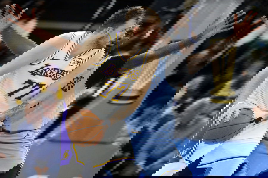 Oct 31, 2025; Memphis, Tennessee, USA; Los Angeles Lakers guard Luka Doncic (77) handles the ball as Memphis Grizzlies forward Vince Williams Jr. (5) defends during the fourth quarter at FedExForum. Mandatory Credit: Petre Thomas-Imagn Images