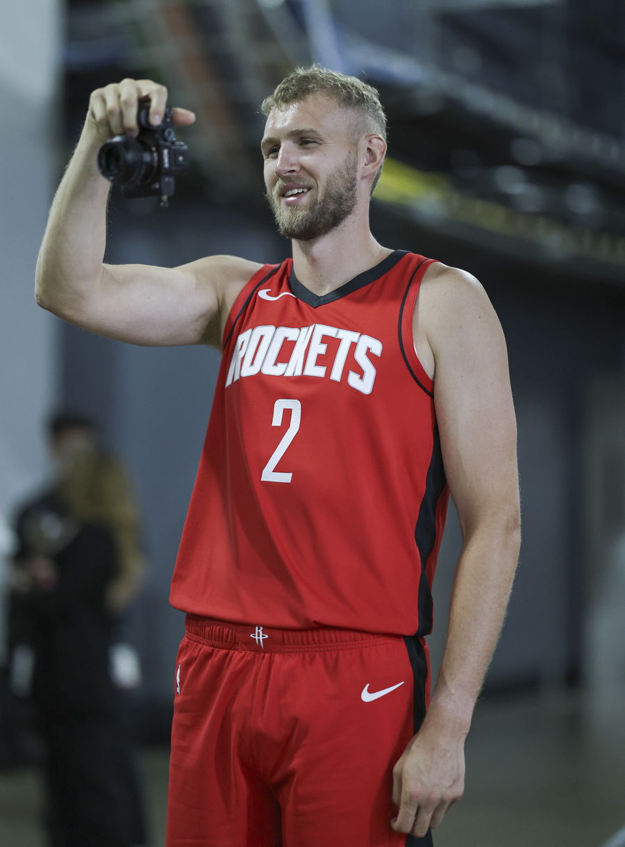 Sep 30, 2024; Houston, TX, USA; Houston Rockets center Jock Landale (2) holds a camera during Houston Rockets media day. Mandatory Credit: Troy Taormina-Imagn Images