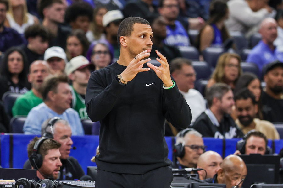 Apr 9, 2025; Orlando, Florida, USA; Boston Celtics head coach Joe Mazzulla motions to the court during the second quarter against the Orlando Magic at Kia Center. Mandatory Credit: Mike Watters-Imagn Images