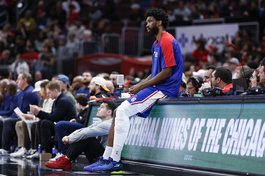 Dec 8, 2024; Chicago, Illinois, USA; Philadelphia 76ers center Joel Embiid (21) waits to enter the game against the Chicago Bulls during the first half at United Center. Mandatory Credit: Kamil Krzaczynski-Imagn Images