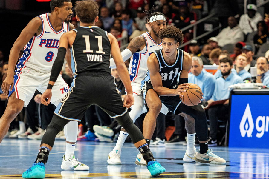 Nov 17, 2023; Atlanta, Georgia, USA; Atlanta Hawks forward Jalen Johnson (1) looks to Atlanta Hawks guard Trae Young (11) while being guarded by Philadelphia 76ers guard De’Anthony Melton (8) and Philadelphia 76ers forward Robert Covington (33) during the first quarter at State Farm Arena. Mandatory Credit: Jordan Godfree-USA TODAY Sports
