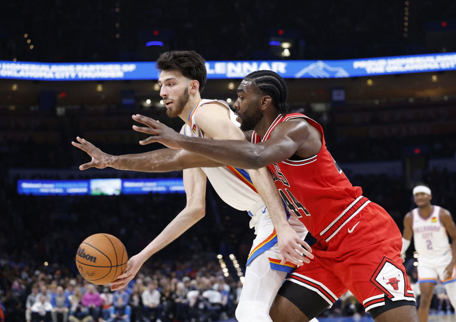 Nov 22, 2023; Oklahoma City, Oklahoma, USA; Chicago Bulls forward Patrick Williams (44) defends Oklahoma City Thunder forward Chet Holmgren (7) as he passes the ball during the second quarter at Paycom Center. Mandatory Credit: Alonzo Adams-USA TODAY Sports