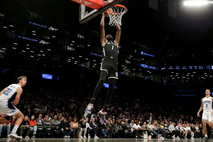 Nov 28, 2022; Brooklyn, New York, USA; Brooklyn Nets forward Kevin Durant (7) dunks against Orlando Magic forward Franz Wagner (22) and forward Caleb Houstan (2) during the third quarter at Barclays Center. Mandatory Credit: Brad Penner-USA TODAY Sports