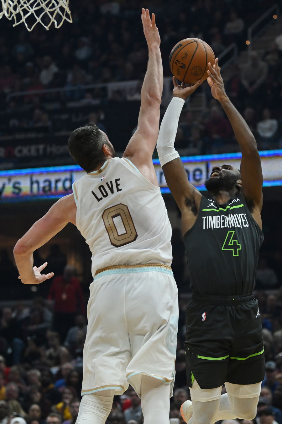 Nov 13, 2022; Cleveland, Ohio, USA; Minnesota Timberwolves guard Jaylen Nowell (4) drives to the basket against Cleveland Cavaliers forward Kevin Love (0) during the first half at Rocket Mortgage FieldHouse. Mandatory Credit: Ken Blaze-USA TODAY Sports