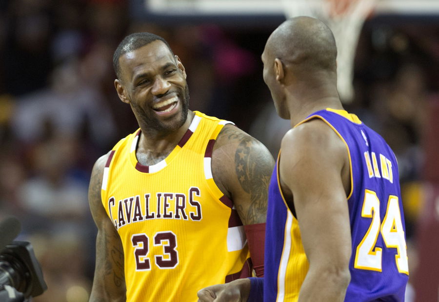 Feb 10, 2016; Cleveland, OH, USA; Cleveland Cavaliers forward LeBron James (23) talks to Los Angeles Lakers forward Kobe Bryant (24) prior to their game at Quicken Loans Arena. Mandatory Credit: David Richard-USA TODAY Sports