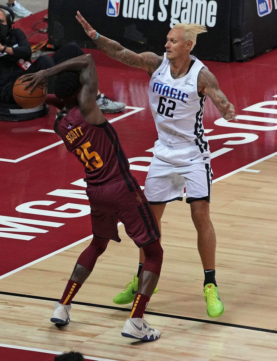 Aug 11, 2021; Las Vegas, Nevada, USA; Orlando Magic forward Janis Timma (62) defends against Cleveland Cavaliers forward Tre Scott (15) during an NBA Summer League game at Thomas & Mack Center. Mandatory Credit: Stephen R. Sylvanie-USA TODAY Sports