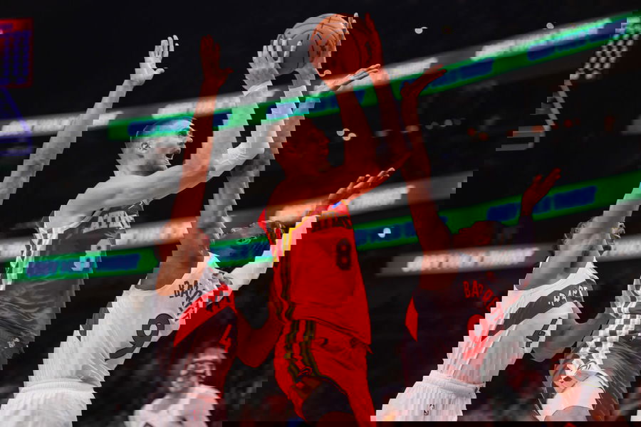 Oct 22, 2025; Atlanta, Georgia, USA; Atlanta Hawks center Kristaps Porzingis (8) shoots past Toronto Raptors forward Scottie Barnes (4) and forward RJ Barrett (9) in the first quarter at State Farm Arena. Mandatory Credit: Brett Davis-Imagn Images
