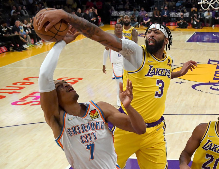 Nov 4, 2021; Los Angeles, California, USA; Los Angeles Lakers forward Anthony Davis (3) blocks the shot of Oklahoma City Thunder forward Darius Bazley (7) in the first half at Staples Center. Mandatory Credit: Jayne Kamin-Oncea-USA TODAY Sports