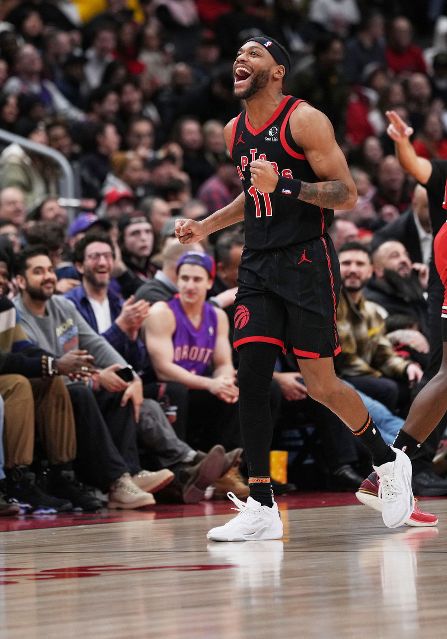Jan 18, 2024; Toronto, Ontario, CAN; Toronto Raptors guard Bruce Brown (11) reacts against the Chicago Bulls during the third quarter at Scotiabank Arena. Mandatory Credit: Nick Turchiaro-USA TODAY Sports
