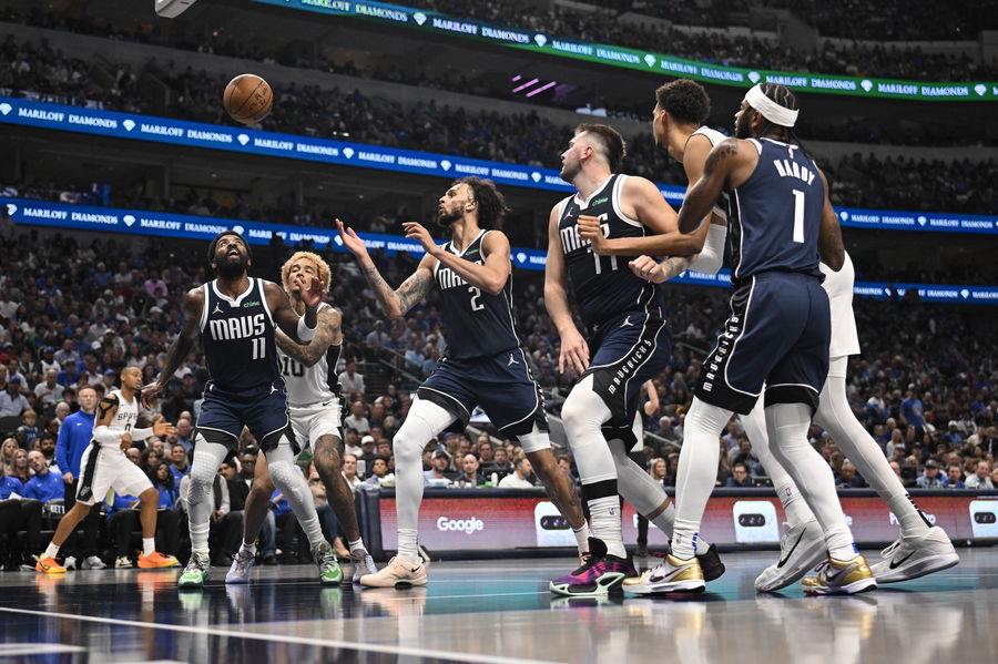 Oct 24, 2024; Dallas, Texas, USA; Dallas Mavericks guard Kyrie Irving (11) and center Dereck Lively II (2) and guard Luka Doncic (77) and guard Jaden Hardy (1) and San Antonio Spurs forward Jeremy Sochan (10) and center Victor Wembanyama (1) look for the ball during the second quarter at the American Airlines Center. Mandatory Credit: Jerome Miron-Imagn Images