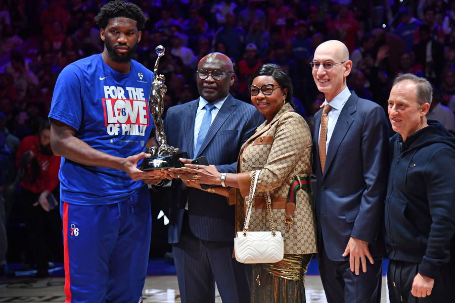 May 5, 2023; Philadelphia, Pennsylvania, USA; Philadelphia 76ers center Joel Embiid (21) holds the MVP trophy with his parents Thomas and Christine, along with NBA Commissioner Adam Silver and 76ers owners Josh Harris before game three of the 2023 NBA playoffs against the Boston Celtics at Wells Fargo Center. Mandatory Credit: Eric Hartline-USA TODAY Sports