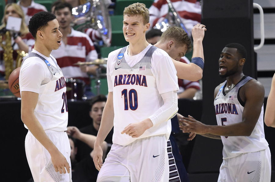 March 18, 2017; Salt Lake City, UT, USA; Arizona Wildcats forward Lauri Markkanen (10) reacts against the Saint Mary’s Gaels during the second half in the second round of the 2017 NCAA Tournament at Vivint Smart Home Arena. Mandatory Credit: Kelvin Kuo-USA TODAY Sports