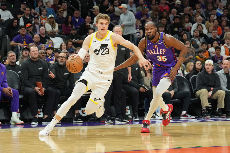 Jan 11, 2025; Phoenix, Arizona, USA; Utah Jazz forward Lauri Markkanen (23) dribbles against Phoenix Suns forward Kevin Durant (35) during the first half at Footprint Center. Mandatory Credit: Joe Camporeale-Imagn Images