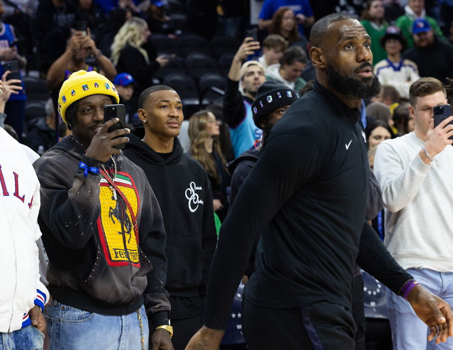 Jan 28, 2025; Philadelphia, Pennsylvania, USA; Philadelphia Eagles A. J. Brown (L) and DeVonta Smith (M) watch as Los Angeles Lakers forward LeBron James (R) warms up before a game against the Philadelphia 76ers at Wells Fargo Center. Mandatory Credit: Bill Streicher-Imagn Images