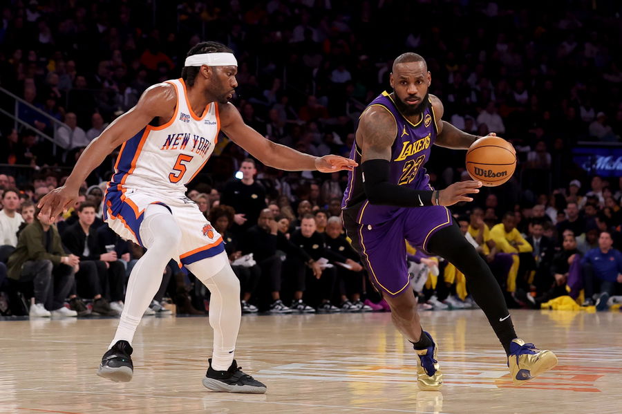 Feb 1, 2025; New York, New York, USA; Los Angeles Lakers forward LeBron James (23) brings the ball up court against New York Knicks forward Precious Achiuwa (5) during the third quarter at Madison Square Garden. Mandatory Credit: Brad Penner-Imagn Images