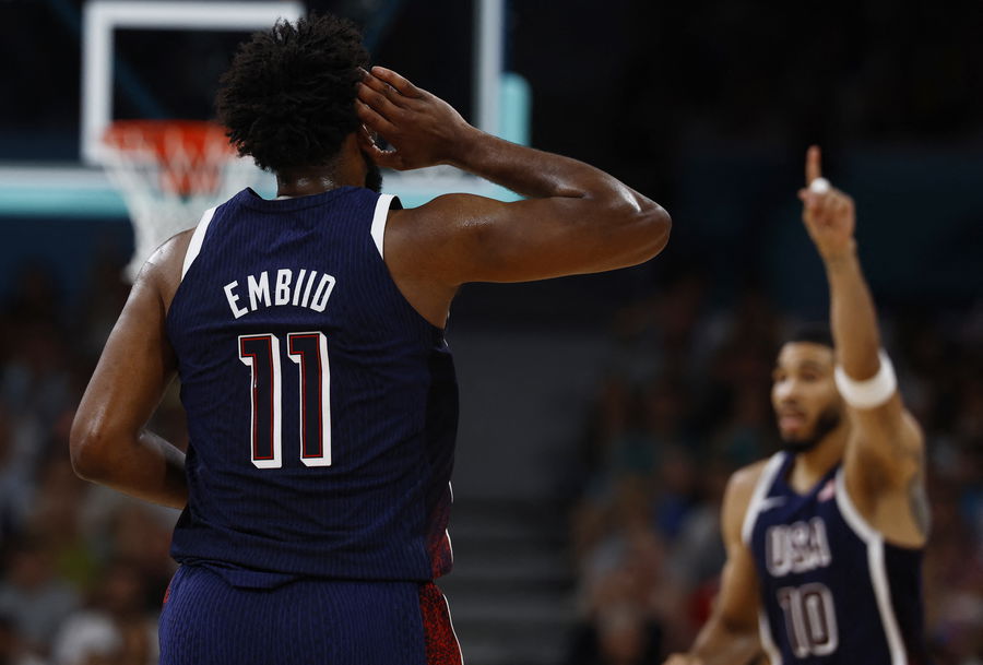 Paris 2024 Olympics – Basketball – Men’s Group Phase – Group C – Puerto Rico vs United States – Lille, Pierre Mauroy Stadium, Villeneve-d’Ascq, France – August 03, 2024. Joel Embiid of United States reacts REUTERS/Evelyn Hockstein
