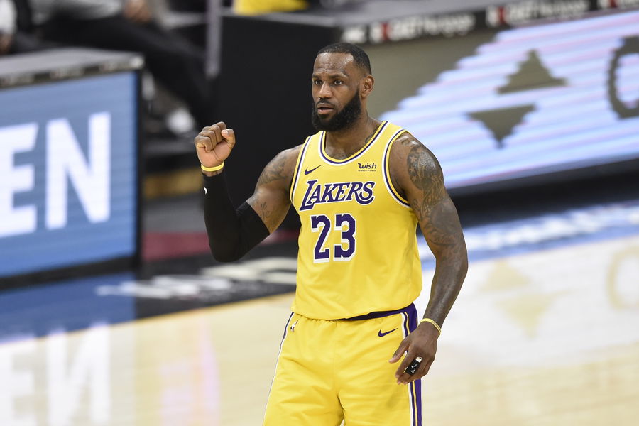 Jan 25, 2021; Cleveland, Ohio, USA; Los Angeles Lakers forward LeBron James (23) celebrates in the fourth quarter against the Cleveland Cavaliers at Rocket Mortgage FieldHouse. Mandatory Credit: David Richard-USA TODAY Sports
