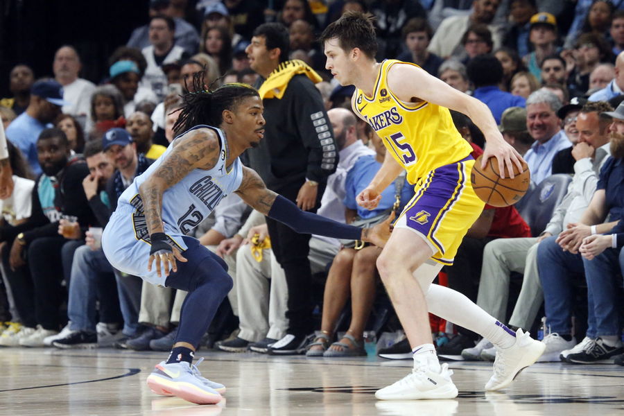 Apr 26, 2023; Memphis, Tennessee, USA; Los Angeles Lakers guard Austin Reaves (15) dribbles as Memphis Grizzlies guard Ja Morant (12) defends during the second half during game five of the 2023 NBA playoffs at FedExForum. Mandatory Credit: Petre Thomas-USA TODAY Sports